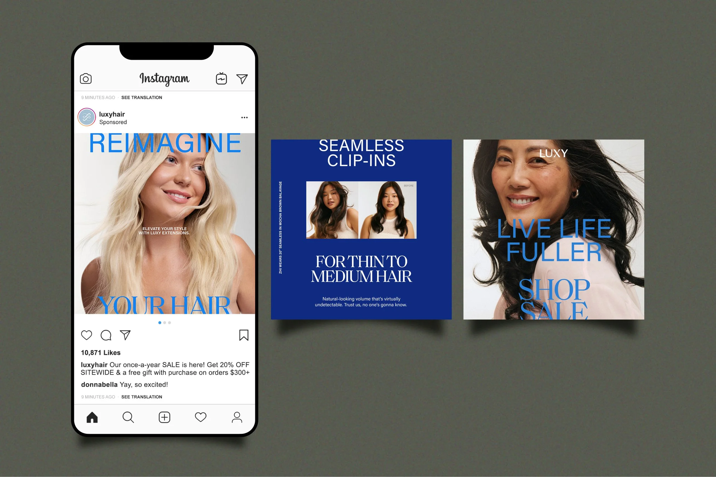 Luxy is the #1-rated ready-to-wear hair extensions brand worldwide, redefining hair extensions since 2010. This premium hair extension & accessories brand prioritizes sustainability and inclusivity through ethical sourcing and exists with the mission of empowering everyone to cultivate a sense of confidence, abundance, and play. This project showcases two of Luxy’s holiday campaigns, both created with the goals of promoting a large sale and standing out among competition during the most highly saturated times of the year. The creative direction for each of these campaigns introduced a new color into the standard brand color palette- a cobalt blue and bright yellow respectively. This creative decision was made with the goals of differentiating from evergreen assets, making a bold an editorial design statement, and increasing brand awareness. These two colors are utilized in a similar way across assets, serving as a bold design accent that both highlights the sale and catches the customers eye- both new and returning.