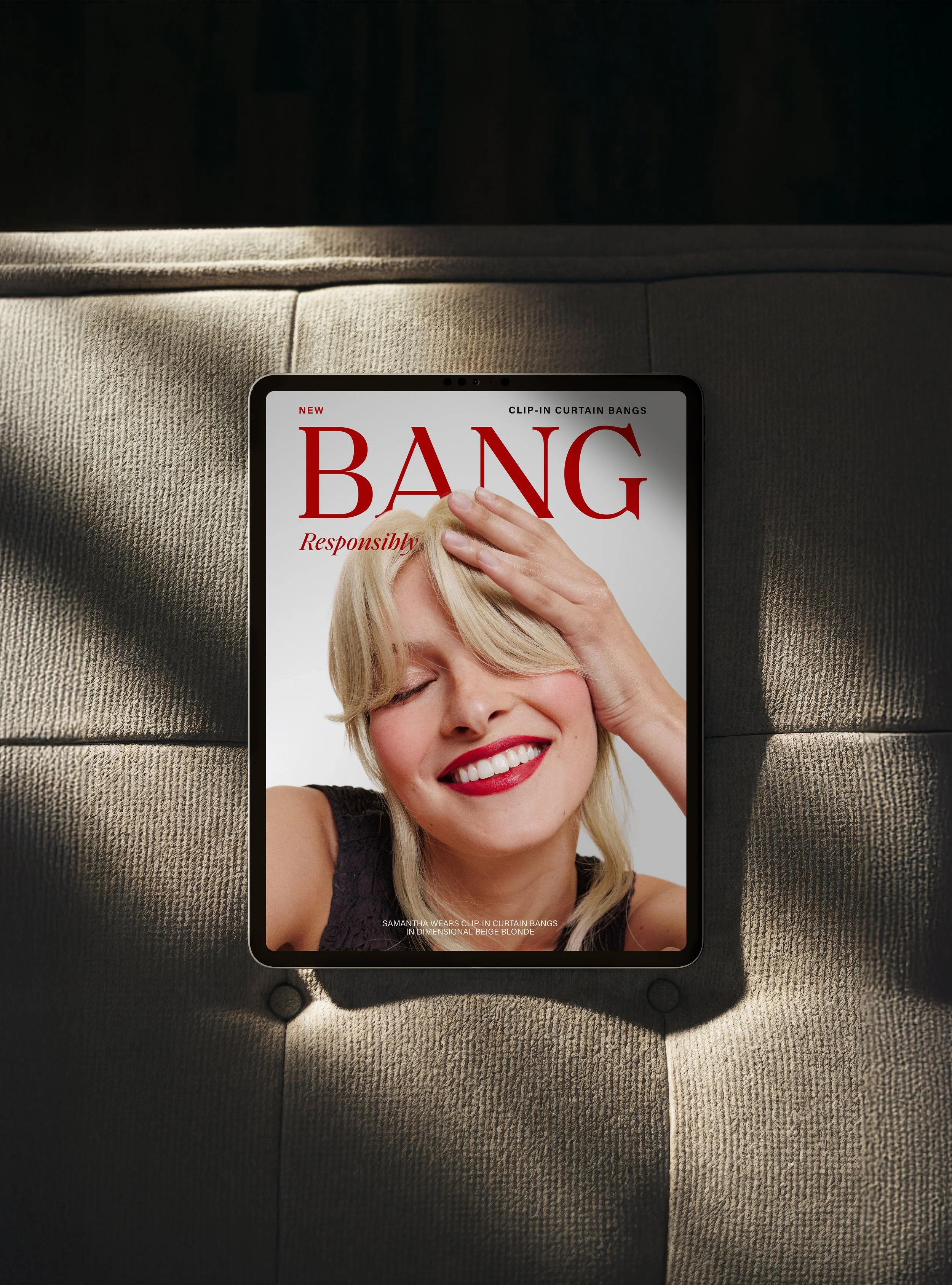 Design campaign assets for the launch of a new hair extension method from Luxy— the Clip-In Curtain Bangs. This assets should translate the creative direction and the brand identity across all channels (ecommerce, paid advertisements, organic social, email, etc.), furthering the brand’s visual story and consumer impressions. Incorporate the dark red accent color (added to the brand palette for this campaign only), as a consistent design accent utilized to stand out from evergreen assets, emphasize the cheeky nature of the messaging through bold editorial typography, and to facilitate memorable impressions on both new returning customers. In order to make a high fashion, editorial design statement with this campaign, incorporate unique layouts, playful typography, and bold compositions into each asset while intertwining the standard color palette and evergreen layouts in order to ensure that everything remains recognizably Luxy.