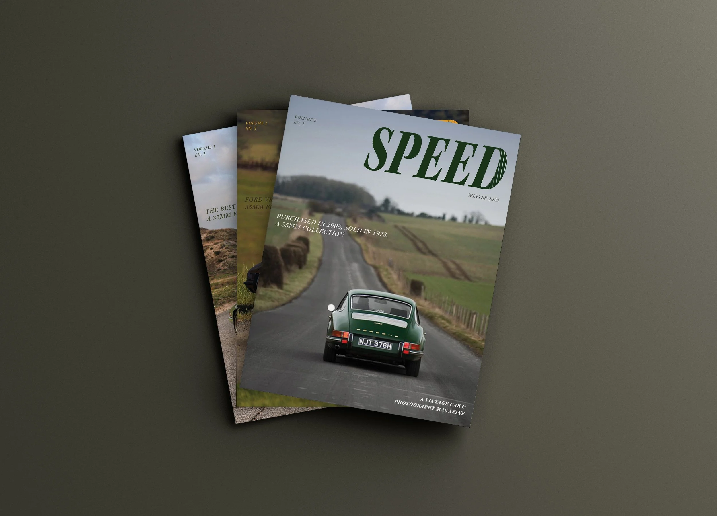 This project presents an original quarterly editorial magazine concept designed to showcase vintage cars through the lens of various photographers—primarily on film. I envisioned the magazine as a collector’s item that would appeal to a broader artistic audience than a traditional car publication, while still offering valuable information and captivating advertisements that uphold the elegant, chic, concise, and exclusive spirit of Speed. I combined carefully curated film photography with elevated, vintage-inspired typography, editorial layouts, and a retro color palette to create a cohesive visual identity that feels both dynamic and innovative. After establishing a comprehensive editorial brand identity—including the masthead/logo, color palette, imagery, and typography—I designed multiple volumes of the publication, featuring covers, spines, and interior spreads that exemplify its distinctive visual language.